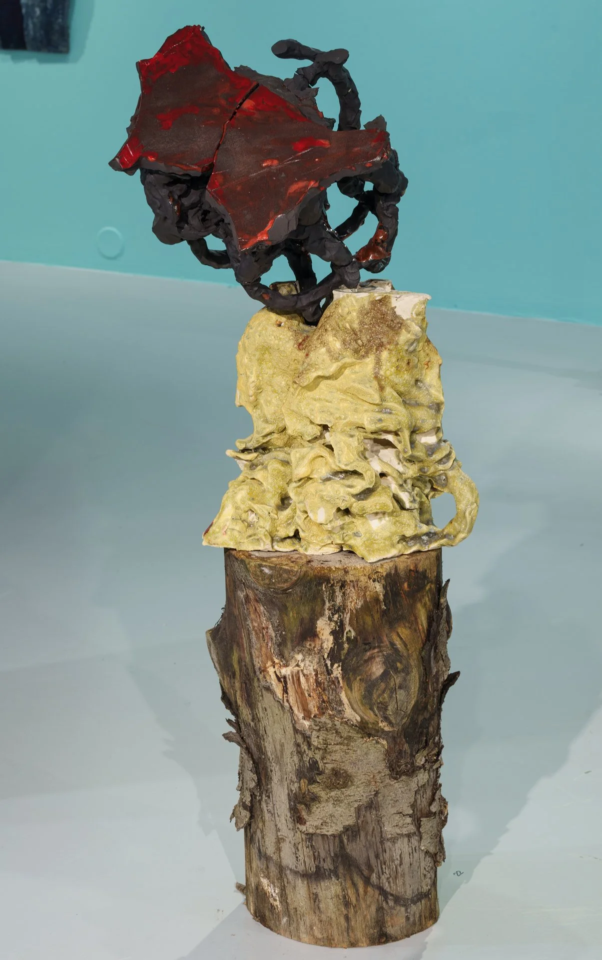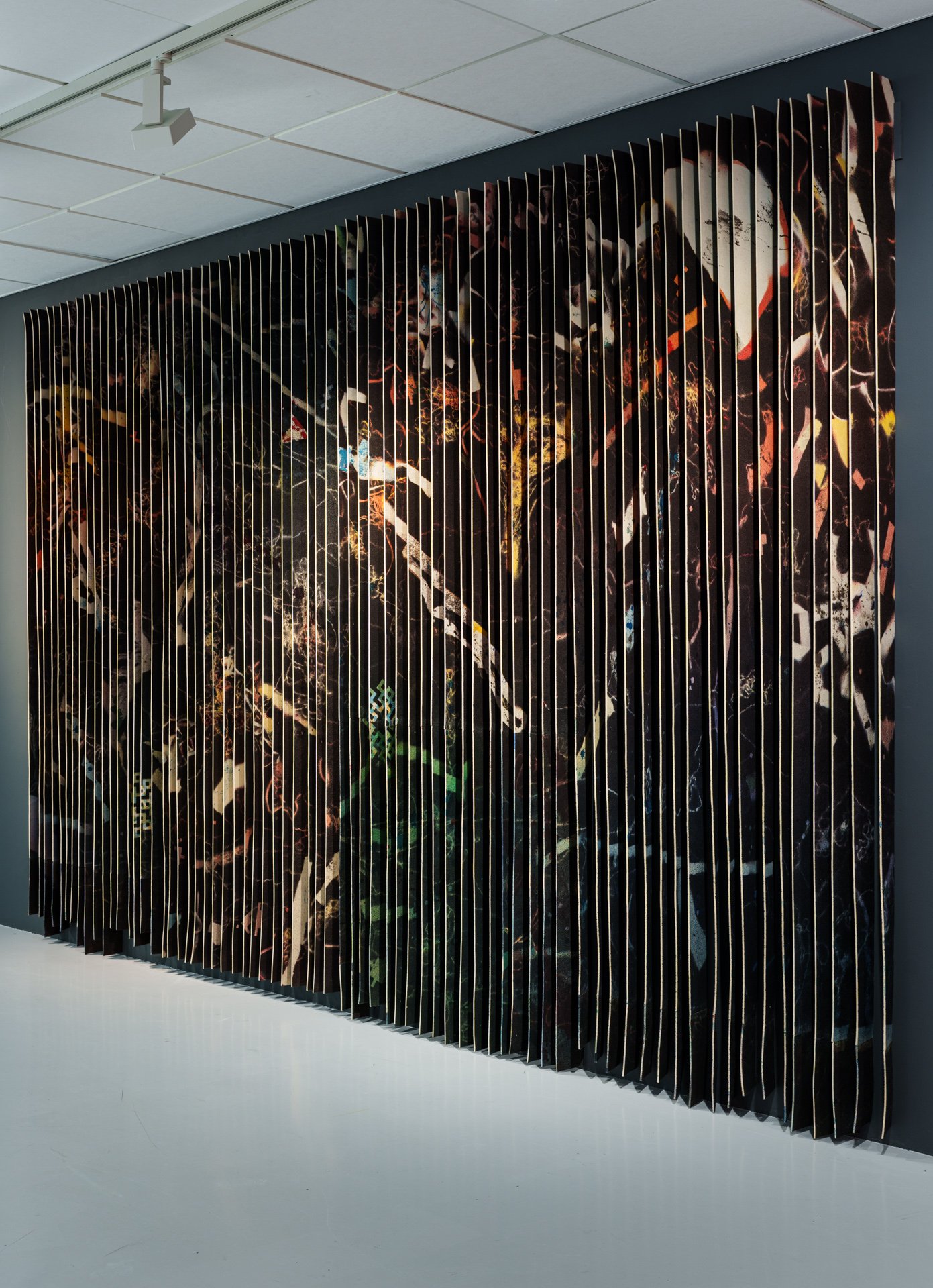 Strimmel etter strimmel med billedbelagt leire bygges om til nye flater og skulpturer, hvor innsiden