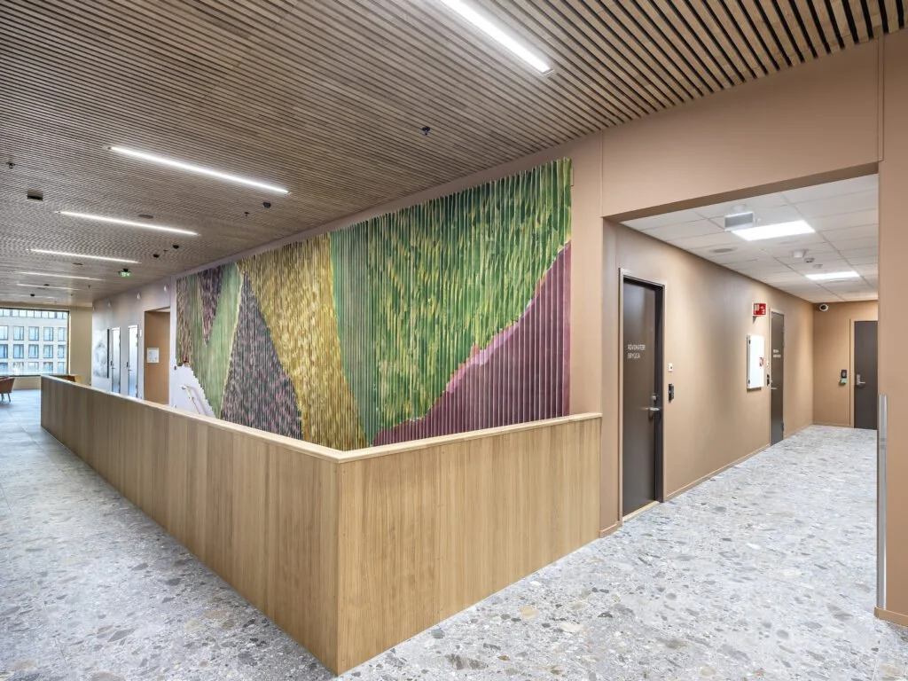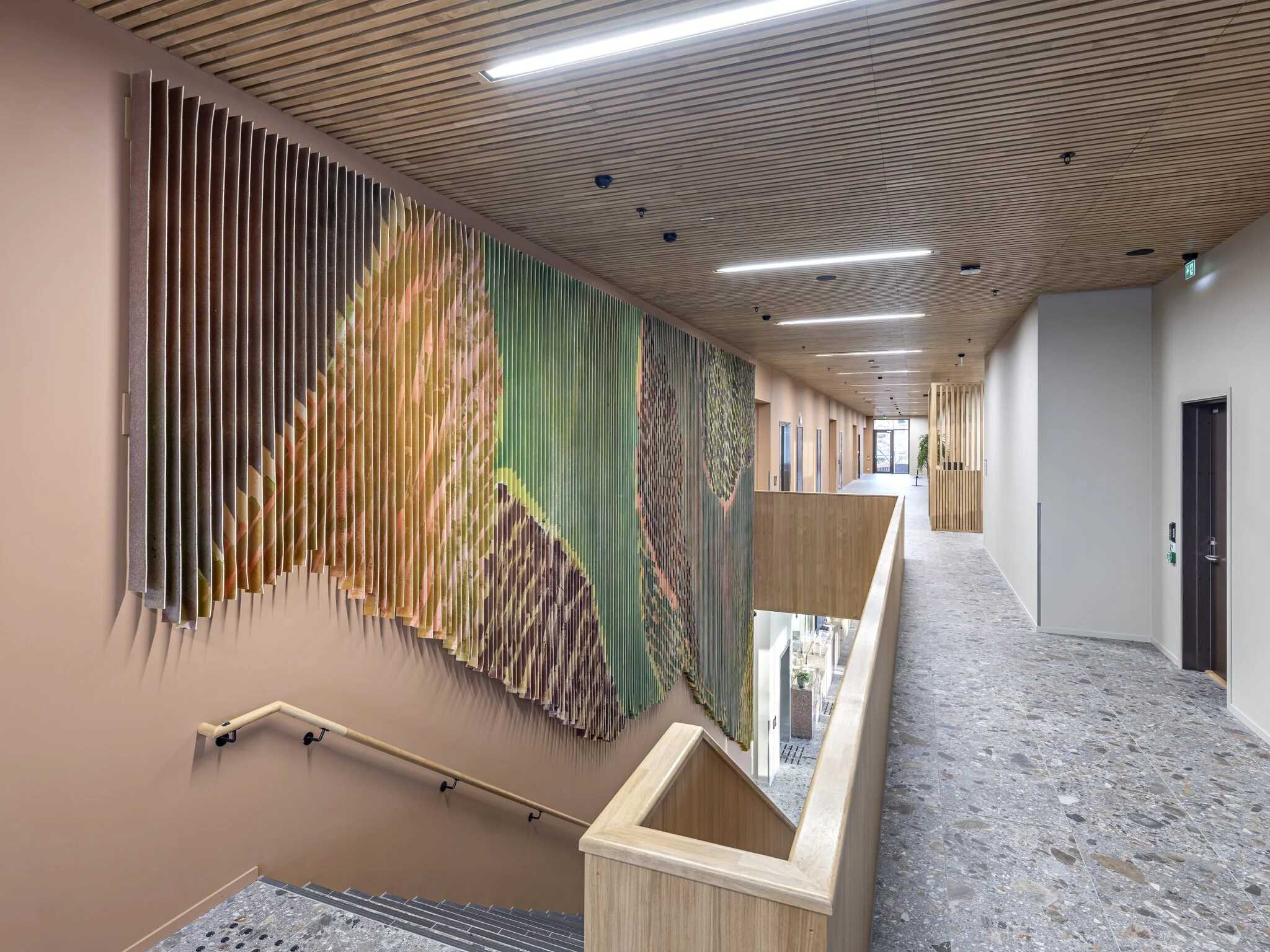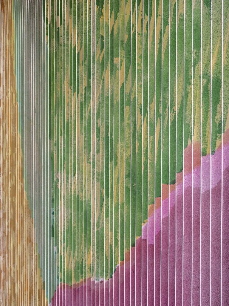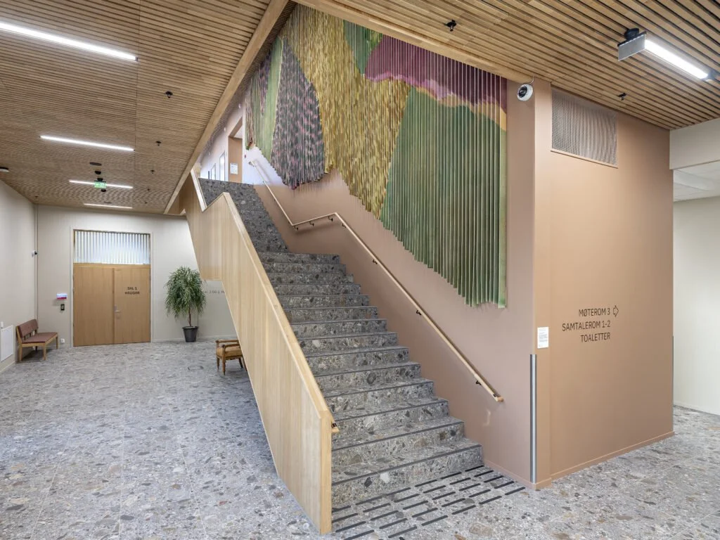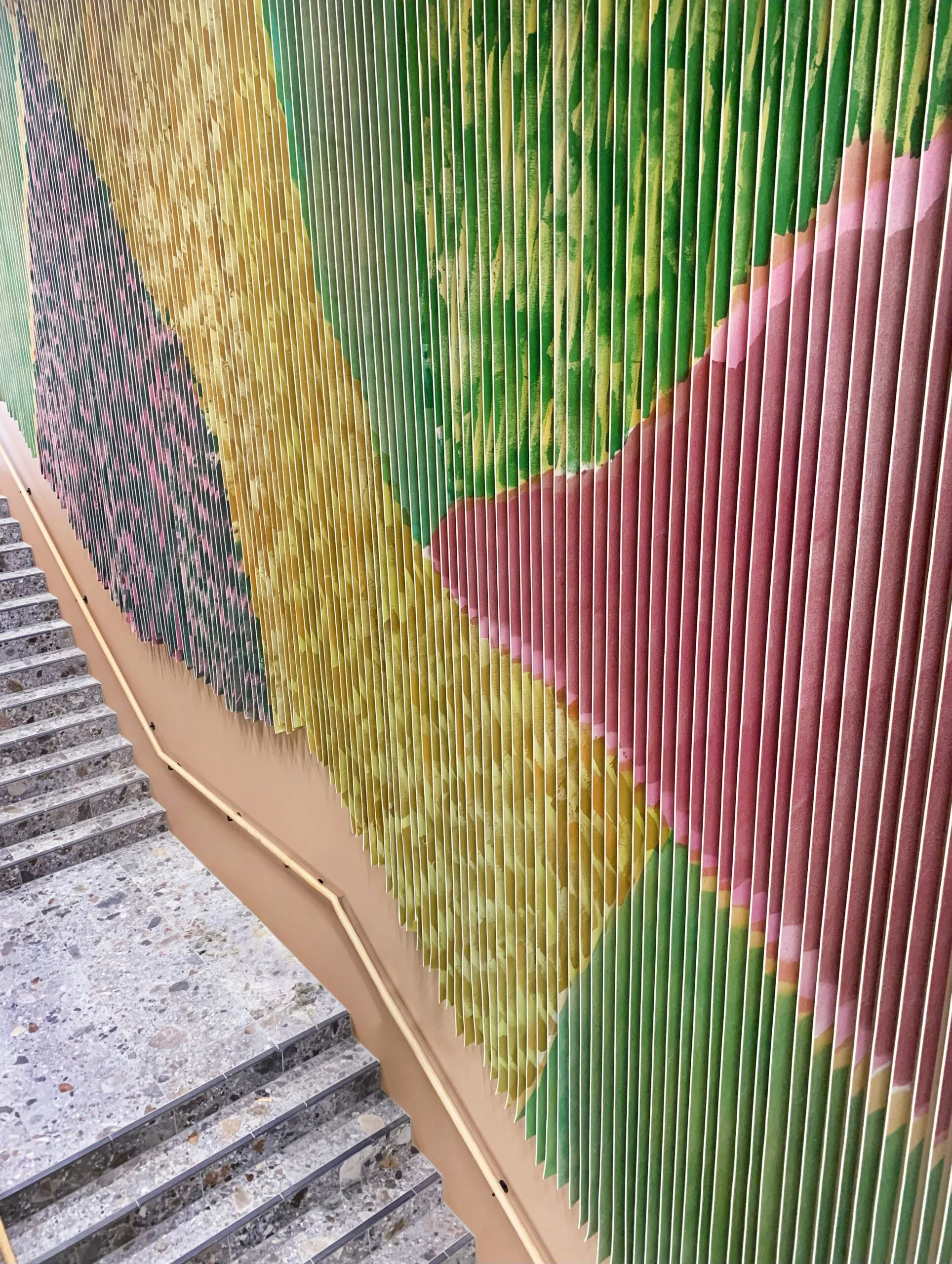 Kunst i offentlig rom, Tønsberg Tinghus 2025. Farget og strimlet ullfilt, montert på mdf list, 176 lameller, 1.3m – 6.5m x 10.5m x 10 cm. Oppdragsgiver Koro- kunst i offentlig rom. Kuratorer Yngvild Færøy og Miki Gebrelul.